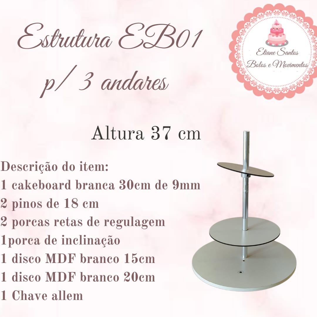 Estrutura para bolo verdadeiro e bolo fake, faz de 1 a 3 andares de bolo 1 cakeboard branca de 30cm de 9mm com 4 furos 1 disco MDF branco de 15 cm de 3mm 1 disco MDF branco de 20 cm de 3mm 2 porcas retas 1 porca de inclinação 1 chave Allen de 3mm
